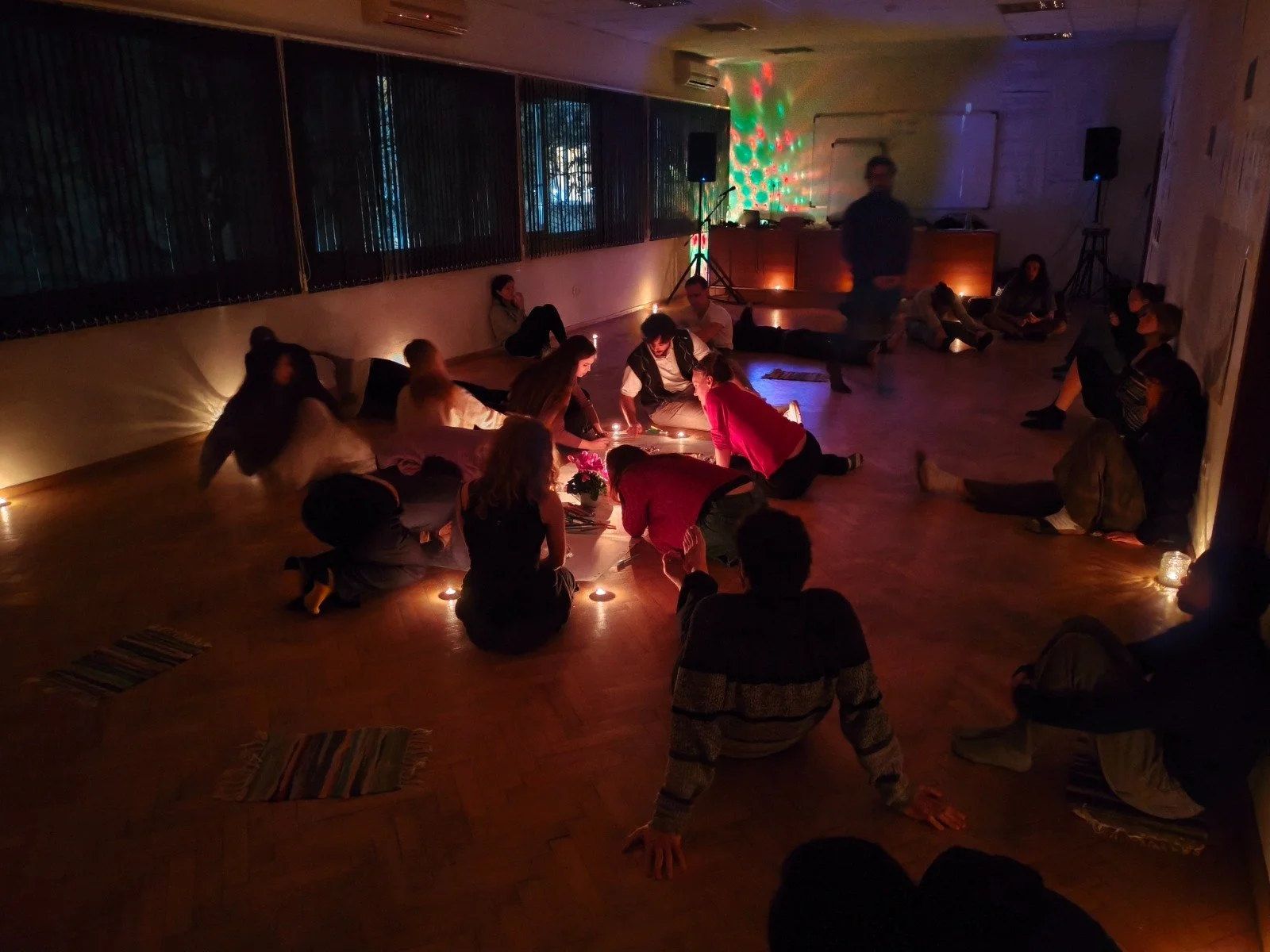 La última noche de este curioso training course la decoraron con velas aromáticas, flores, bombones, piedrecitas, pétalos y en el centro un gran papel para que dibujemos lo que sintamos en ese momento que, junto con la música y la compañía, creamos un muy bonito recuerdo mirándonos a los ojos, cantando y abrazándonos, siendo conscientes de con quién acabamos de pasar 8 días compartiendo estas emociones tan complejas y bellas <3